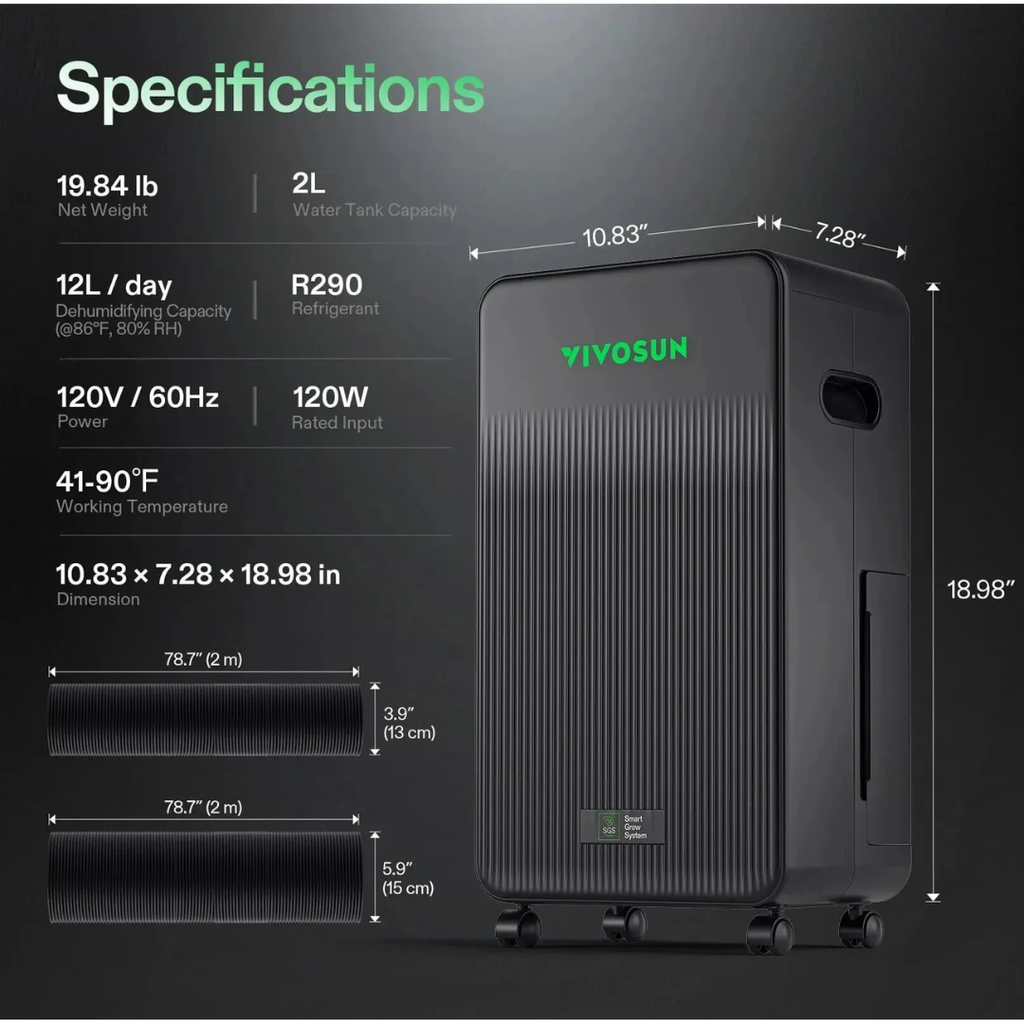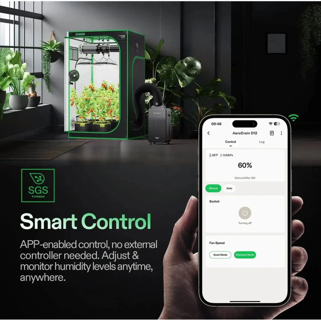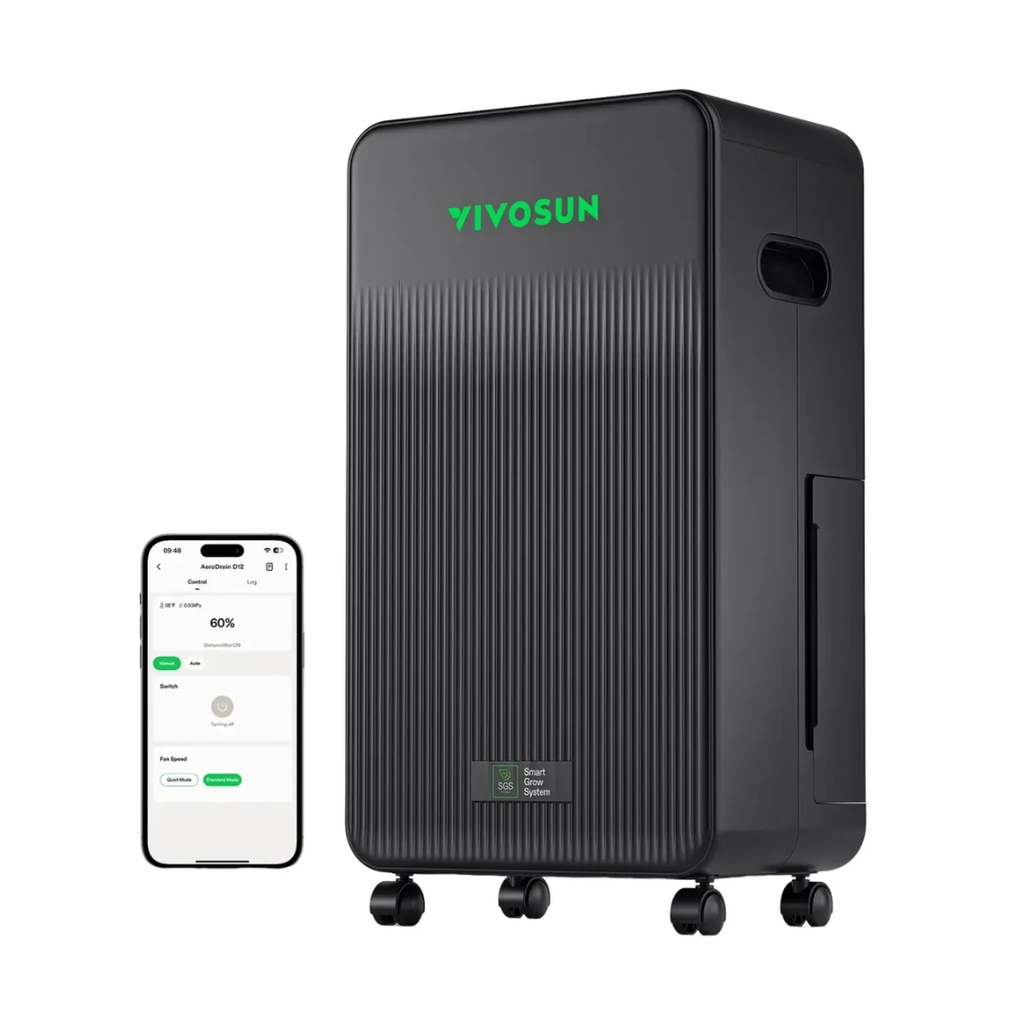 Maintain ideal conditions in your grow tent with the Vivosun AeroDrain D12 — a compact, intelligent dehumidifier designed to optimise plant health and environmental stability. Built for grow tents up to 1.5 × 1.5 meters (5×5), this unit integrates seamlessly with the Vivosun Smart Grow System, offering remote monitoring and automated adjustments via the Vivosun mobile app.